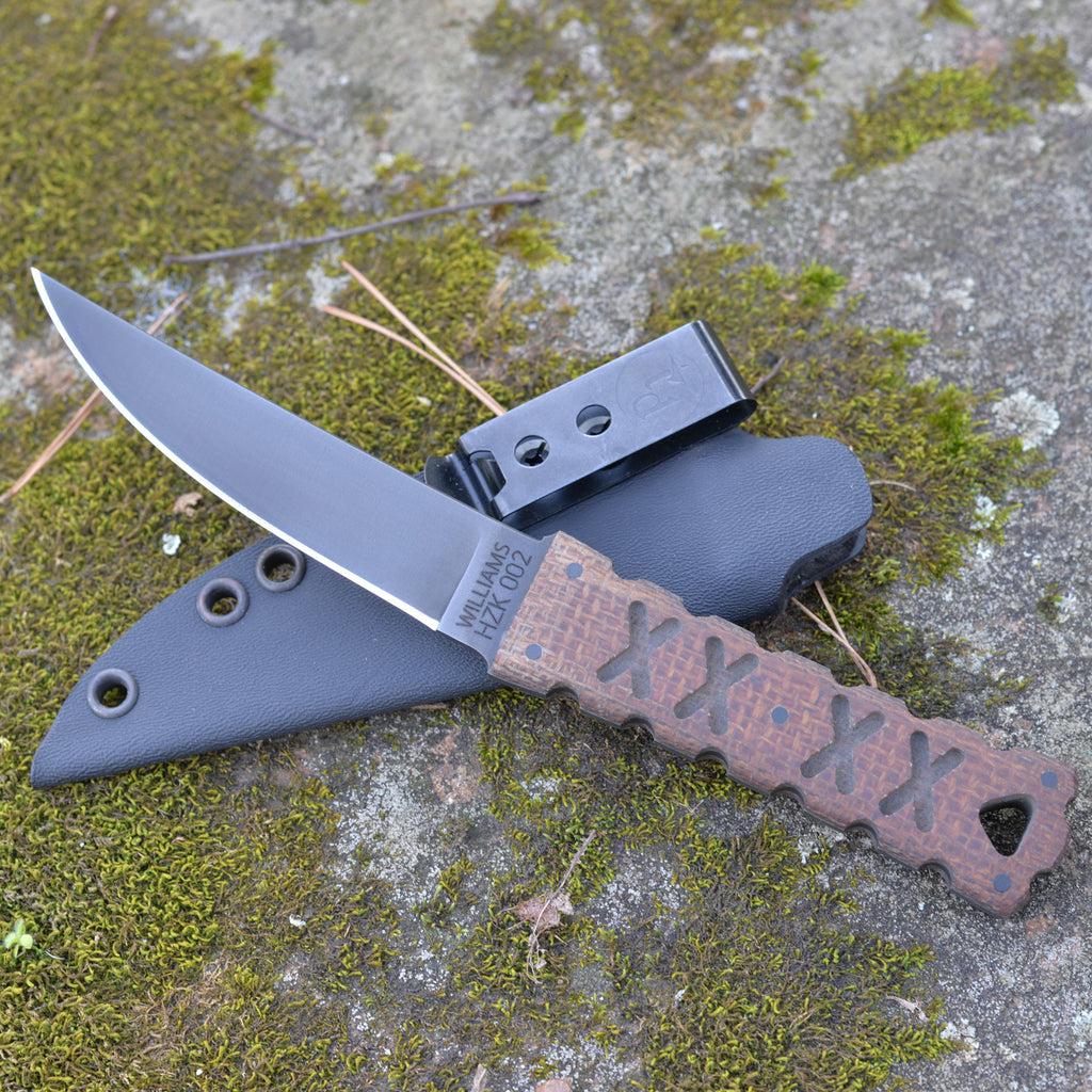 Based on the same design platform as our larger HZT and HZO, the HZK series is a compact knife perfect for EDC. With a 4.5” blade, and low-profile lined kydex sheath, it is easy and comfortable to carry. 80CrV2 carbon steel and a pinned micarta handle make for battle-tested reliability. An excellent companion for both outdoor and tactical environments. The HZK 002 batch features burlap micarta for excellent texture and grip. The deep brown blends into a variety of environments.