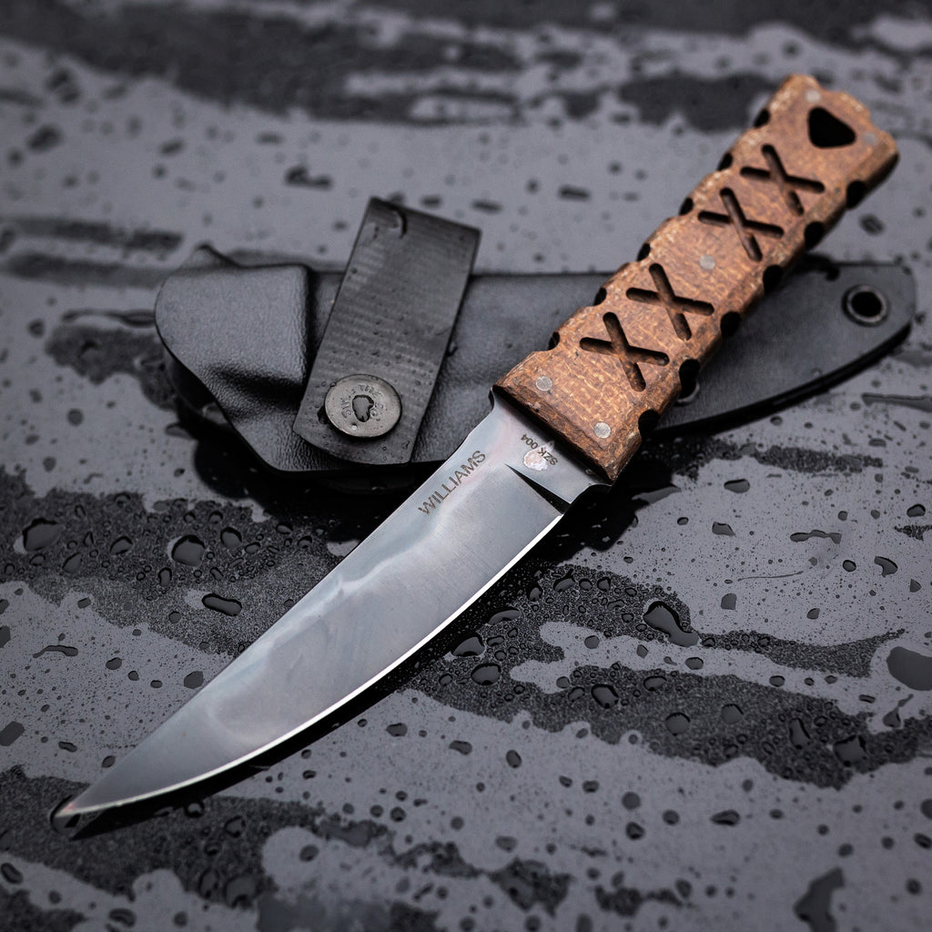 The SZK series features a classic Shobu Zukuri grind for excellent lateral strength and cutting ability. Part of our EDC fixed blade line, this knife is optimized for compact and comfortable carry. Featuring a Vanadius 4 Extra blade, one of the toughest tool steels on the market, and burlap micarta handle scales with brass pins. We produced this blade with TRC Knives because of their reputation for outstanding craftsmanship and attention to detail. The SZK 004 is a limited run batch of 130 pieces. This knife features a tool steel blade, basic care is required to avoid corrosion.