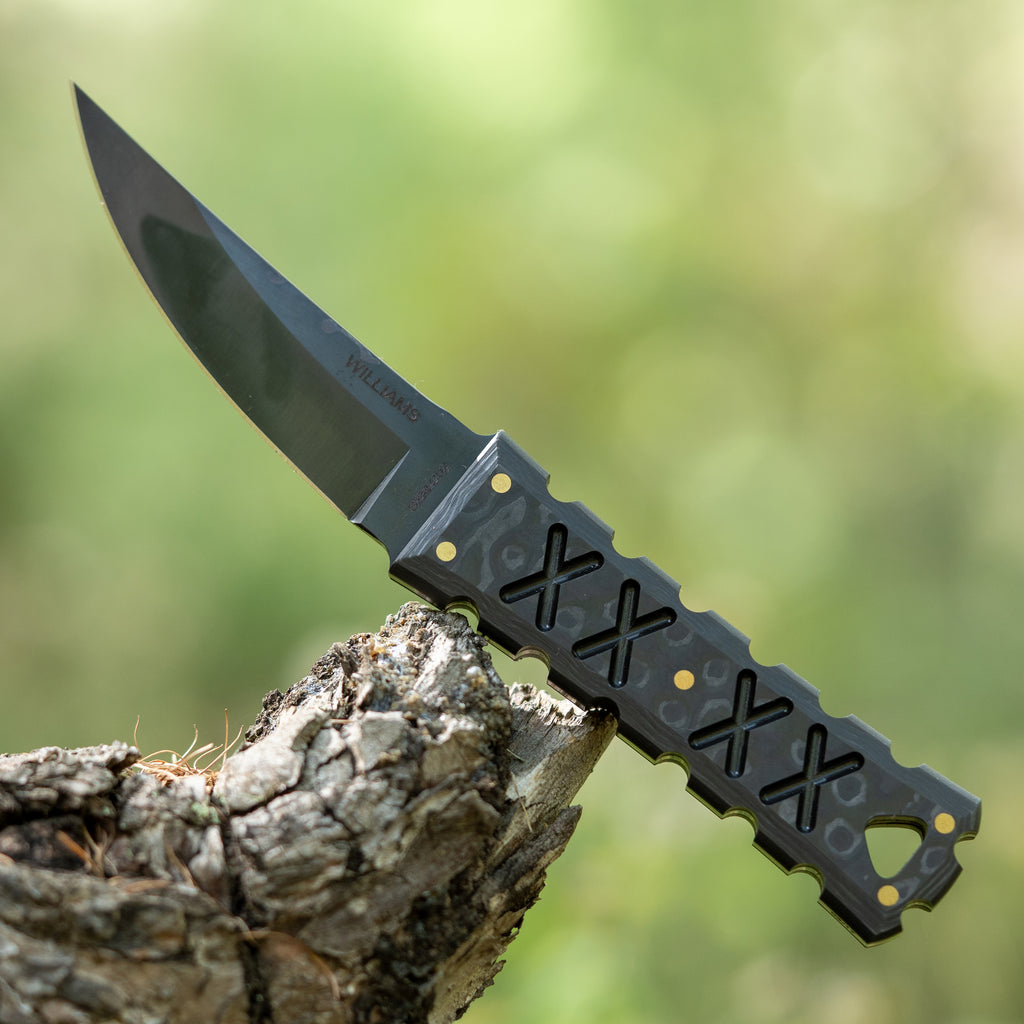 The smallest blade in our Shobu Zukuri series, with the same classic grind for excellent lateral strength and cutting ability. Part of our EDC fixed blade line, this knife is optimized for compact and comfortable carry. Featuring an exceedingly tough Vanadis 4 Extra blade, and Black Camo carbon fiber handle scales from FatCarbon with brass pins. We produced this blade with TRC Knives because of their reputation for outstanding craftsmanship and attention to detail. This is a limited custom batch of 17 pieces.