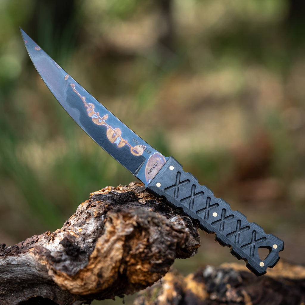 The largest blade in our Shobu Zukuri series, with the same classic grind for excellent lateral strength and cutting ability. This full sized knife is designed for maximum utility in an easily carryable size. Featuring a Vanadius 4 Extra blade, one of the toughest tool steels on the market, and Black Camo carbon fiber handle scales from FatCarbon Materials. We produced this blade with TRC Knives because of their reputation for outstanding craftsmanship and attention to detail. The SZT C02 is a knife made for hard use, but with the refinement of a collector’s piece. This is an individually numbered custom batch of 25 pieces.